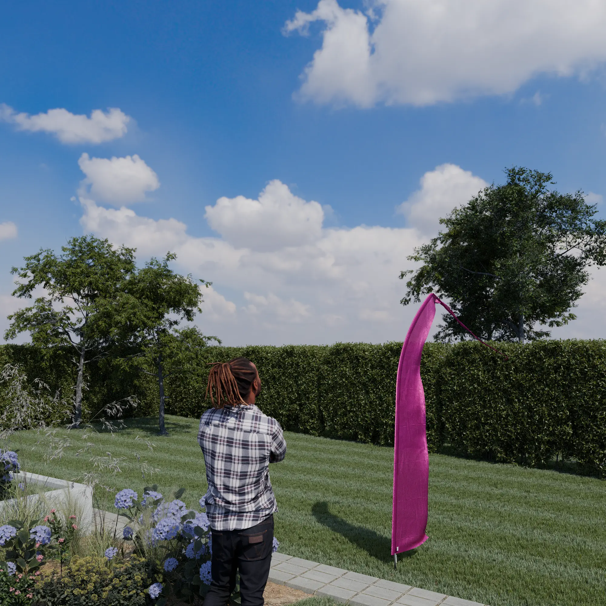 Die angegebene Länge entspricht der Gesamtlänge der Balifahne, von dem Ende, an dem die Stange eingeführt wird, bis zur Spitze. Der Tunnel, durch den die Stange geht, ist etwa 50–100 cm (je nach Fahnenengesamtlänge) vor dem Ende abgenäht, damit die Spitze schön herabhängt und im Wind spielen kann.
