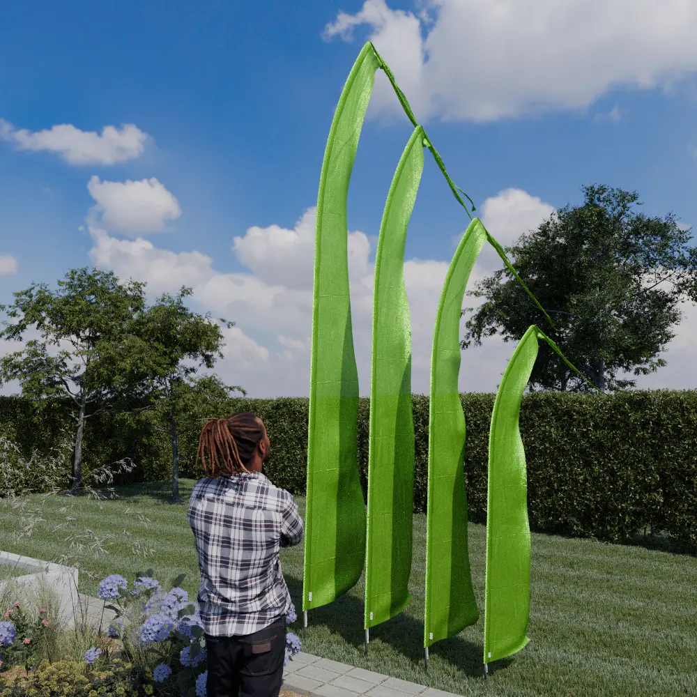 Die angegebene Länge entspricht der Gesamtlänge der Balifahne, von dem Ende, an dem die Stange eingeführt wird, bis zur Spitze. Der Tunnel, durch den die Stange geht, ist etwa 50–100 cm (je nach Fahnenengesamtlänge) vor dem Ende abgenäht, damit die Spitze schön herabhängt und im Wind spielen kann.