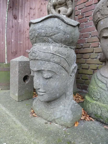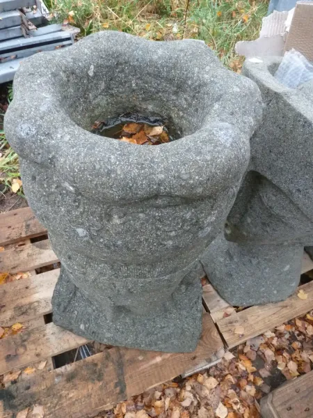 Frauenkopf mit Schale . Basanit ist ein vulkanisches, grünliches Gestein. Der Stein erhält seine charakteristische Farbe durch viele Tonminerale. Die kleinen bis mittelgroßen Vertiefungen im Gestein sind ein charakteristisches Merkmal und kennzeichnen die gute Qualität des Natursteins. Die Skulpturen sind frostbeständig, vertragen aber kein Streusalz.