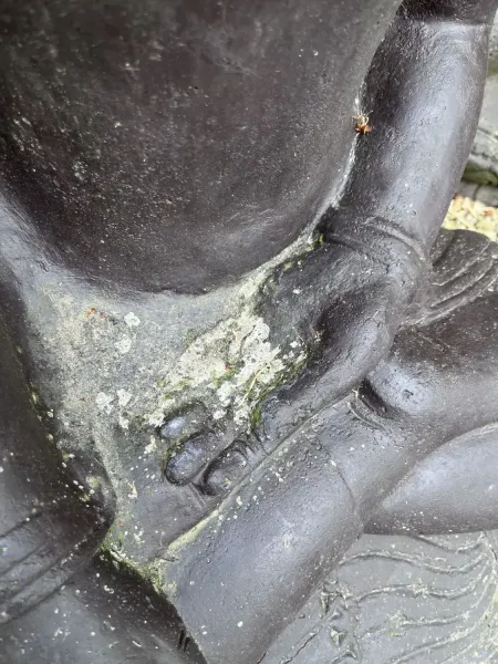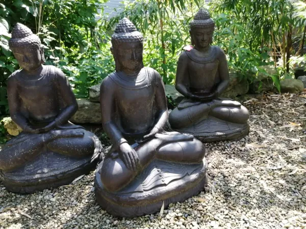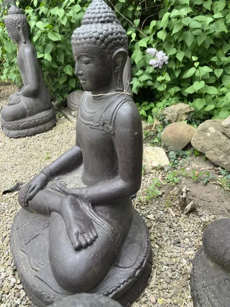 Ein schneidiger und ruhiger sitzender Buddha, Indien, 80 cm hoch, Das Modell ist schon längere Zeit in unserer Ausstellung. Mittlerweile hat die Skulptur schöne Patina angesetzt. Bei dieser Buddha-Skulptur liegen beide Hände locker im Schoß, eine Hand ruht auf der anderen, die Handflächen zeigen nach oben: Diese Handhaltung symbolisiert die Meditation (Dhyana Mudra). Ein gewisser Anteil des Betons und des Steingutes wird durch eine Art Kunststoff ersetzt, wodurch wir das Gewicht der Skulpturen in einigen Fällen um mehr als 50% reduzieren können. Das geringe Gewicht garantiert eine einfache Handhabung, einen leichten Versand etc. Diese schöne Skulptur ist aus hochwertigem Steinguss, absolut frost- und witterungsbeständig.