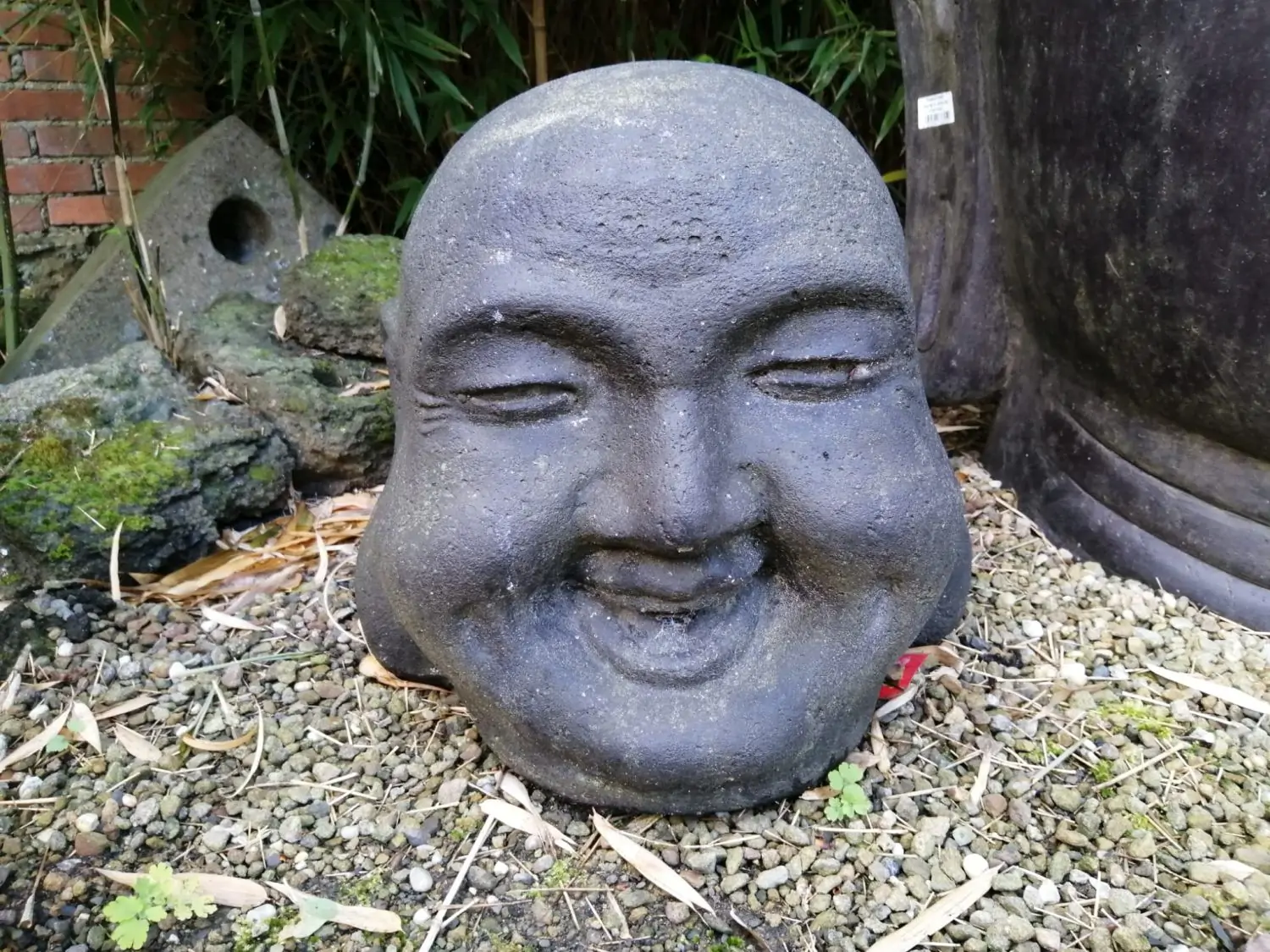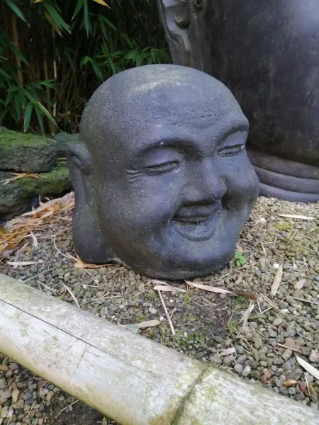 Ausstellungsstück - Chinesischer Buddha-Kopf, lachend, 41cm Höhe, Steinguss Das Modell ist schon längere Zeit in unserer Ausstellung. Mittlerweile hat die Skulptur schöne Patina angesetzt.  Diese schöne Skulptur ist aus hochwertigem Steinguss, absolut frost- und witterungsbeständig.