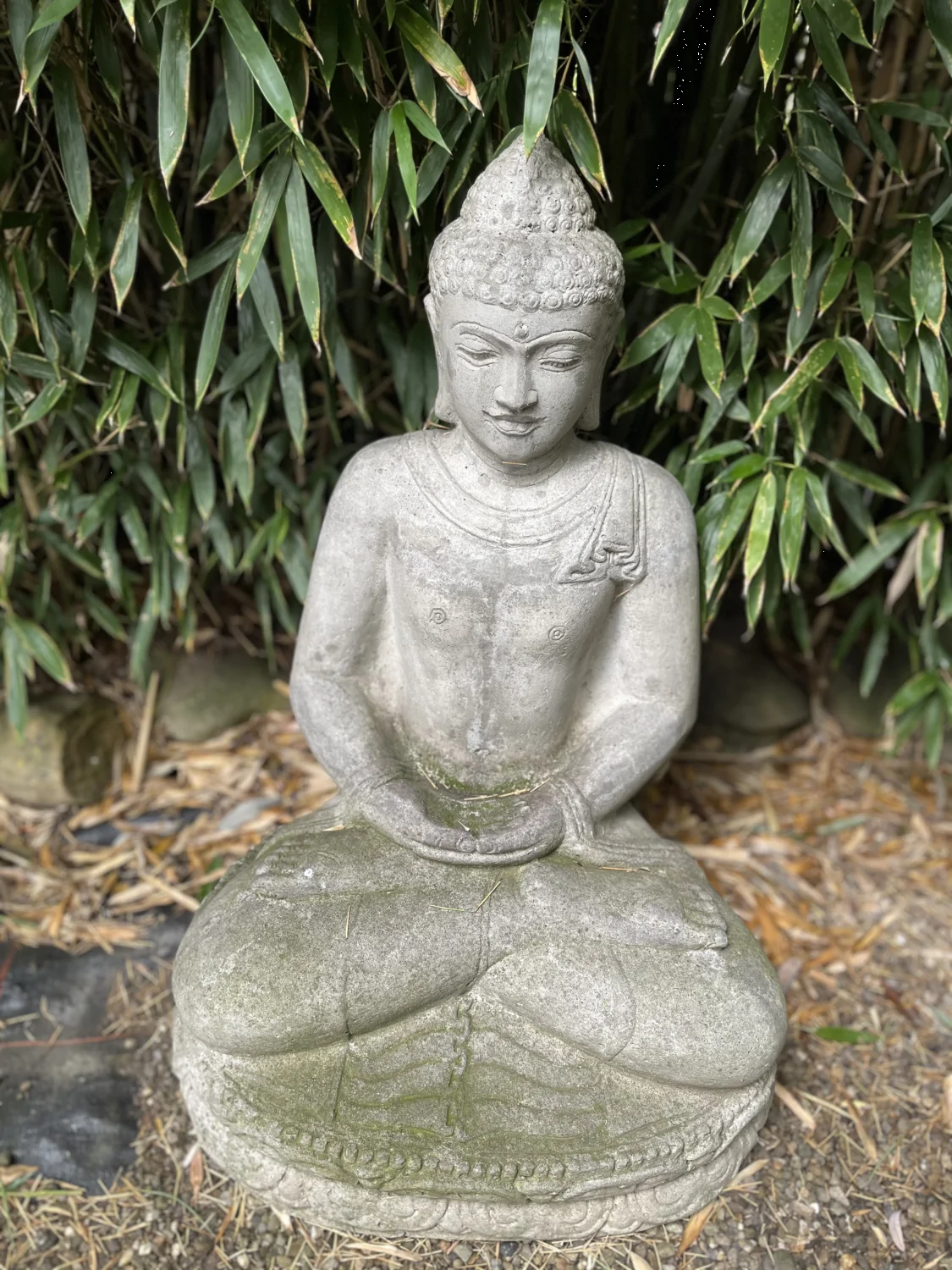 Sitzender Buddha aus Vollguss – Meditationspose, Steinguss im Garten-Ambiente (Ausstellung)
