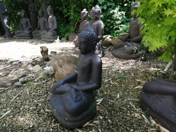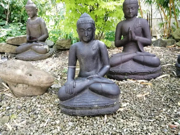 Ausstellungsstück - Ein schneidig sitzender Buddha. Das Modell ist schon längere Zeit in unserer Ausstellung. Mittlerweile hat die Skulptur schöne Patina angesetzt. Die Skulptur wurde aus Steinguss gefertigt und mit einer Lackierung versehen. Er hat beide Hände locker in seinem Schoß, eine Hand ruht auf der anderen, die Handflächen zeigen nach oben: Diese Handhaltung symbolisiert die Meditation (Dhyana Mudra). Die Farbe kann durch Witterungseinflüsse variieren und verblassen, aber das Finish hat keinen Einfluss auf die Frostbeständigkeit.