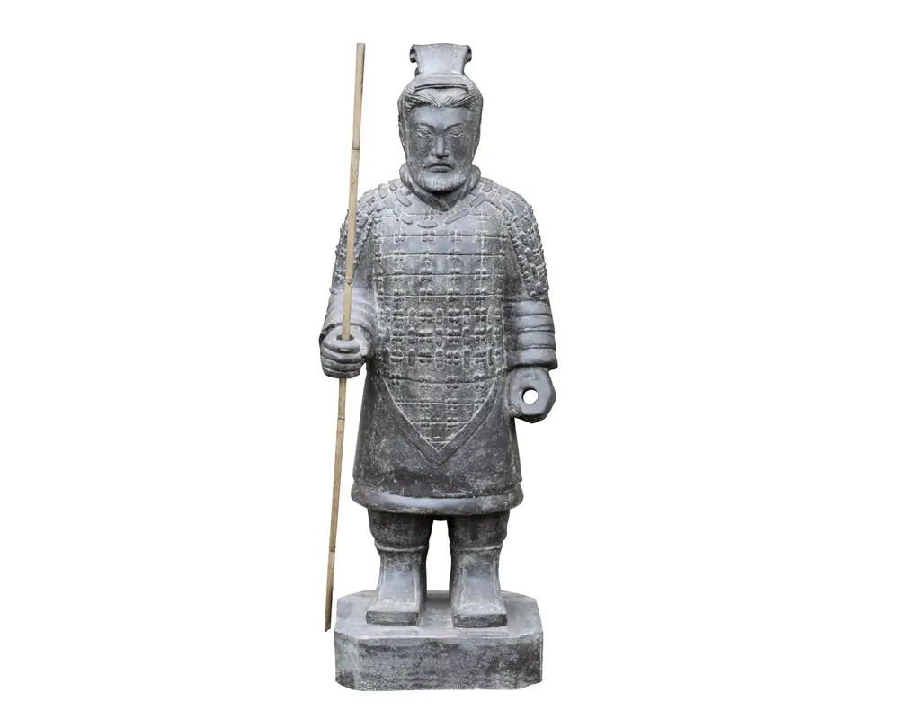 Dieser stehende chinesische Krieger wurde aus Steinguss gegossen. Die Vorlage gab einer der Krieger aus der berühmten Terracotta Armee des Kaisers Qin Shi Huang Di.