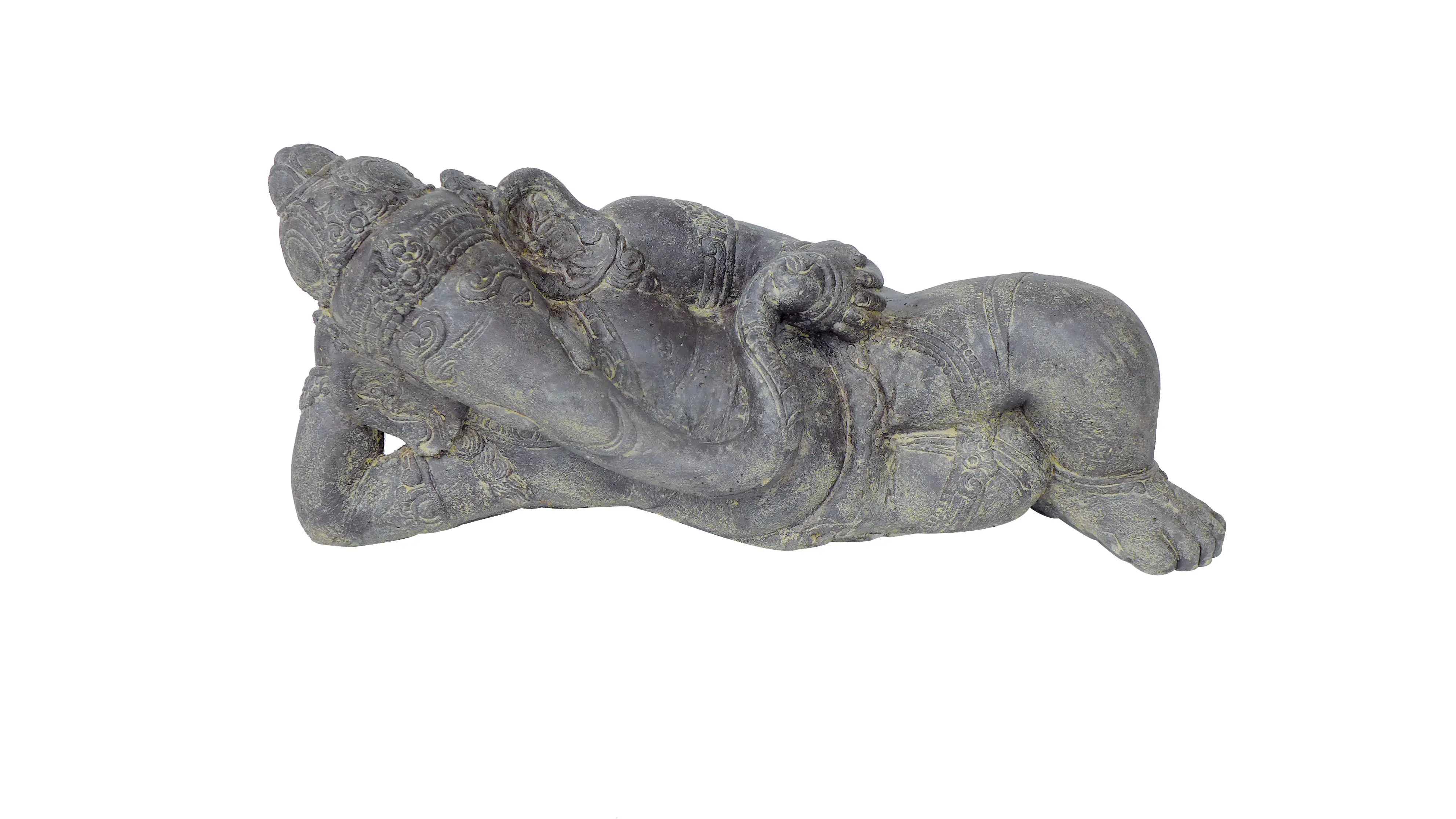 Der elefantenköpfige Gott ist der Tradition gemäß sitzend und mit einem kindlichen, fülligen Körper dargestellt. Dieser Ganesha liegt entspannt. Die fröhlich-positive und zugleich ruhige, gelassene und konzentrierte Ausstrahlung der Skulptur spiegelt die vielfältigen Segnungen wieder, die im Hinduismus mit Ganesha in Verbindung gebracht werden.