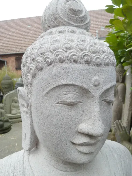 Der sitzende Buddha wurde aus Flussstein, einem Granit ähnlichen Stein, gearbeitet. Dieser Stein ist härter als der bei uns übliche Basanitstein und lässt sich dadurch detailierter und präziser bearbeiten.