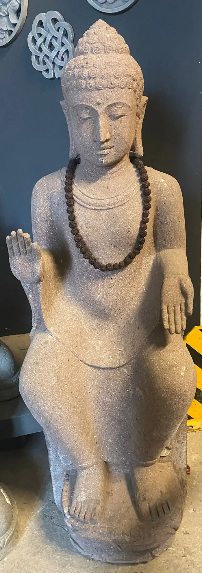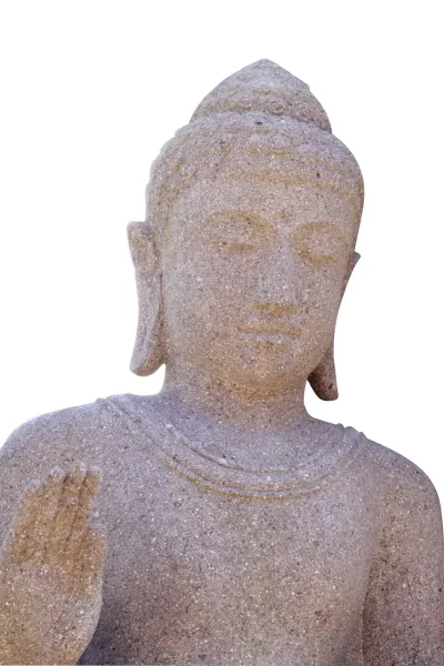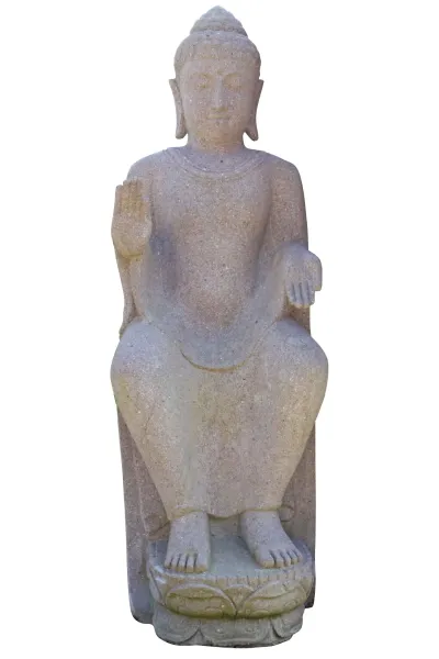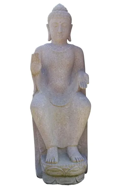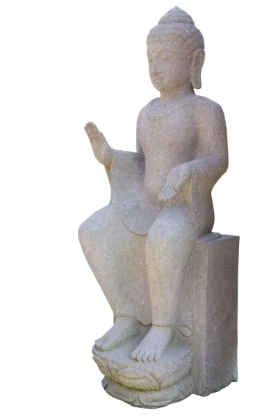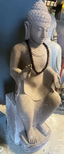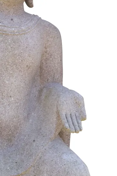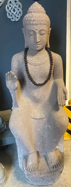 Ein Buddha, der durch seine feine Ausarbeitung und Ausstrahlung überzeugt. Der sitzende Buddha wurde aus Flussstein, einem Granit ähnlichen Stein, gearbeitet. Dieser Stein ist härter als der bei uns übliche Basanitstein und lässt sich dadurch detailierter und präziser bearbeiten. Nur wenige Künstler haben die Fähigkeiten diesen Stein zu einem Highlight zu verarbeiten.