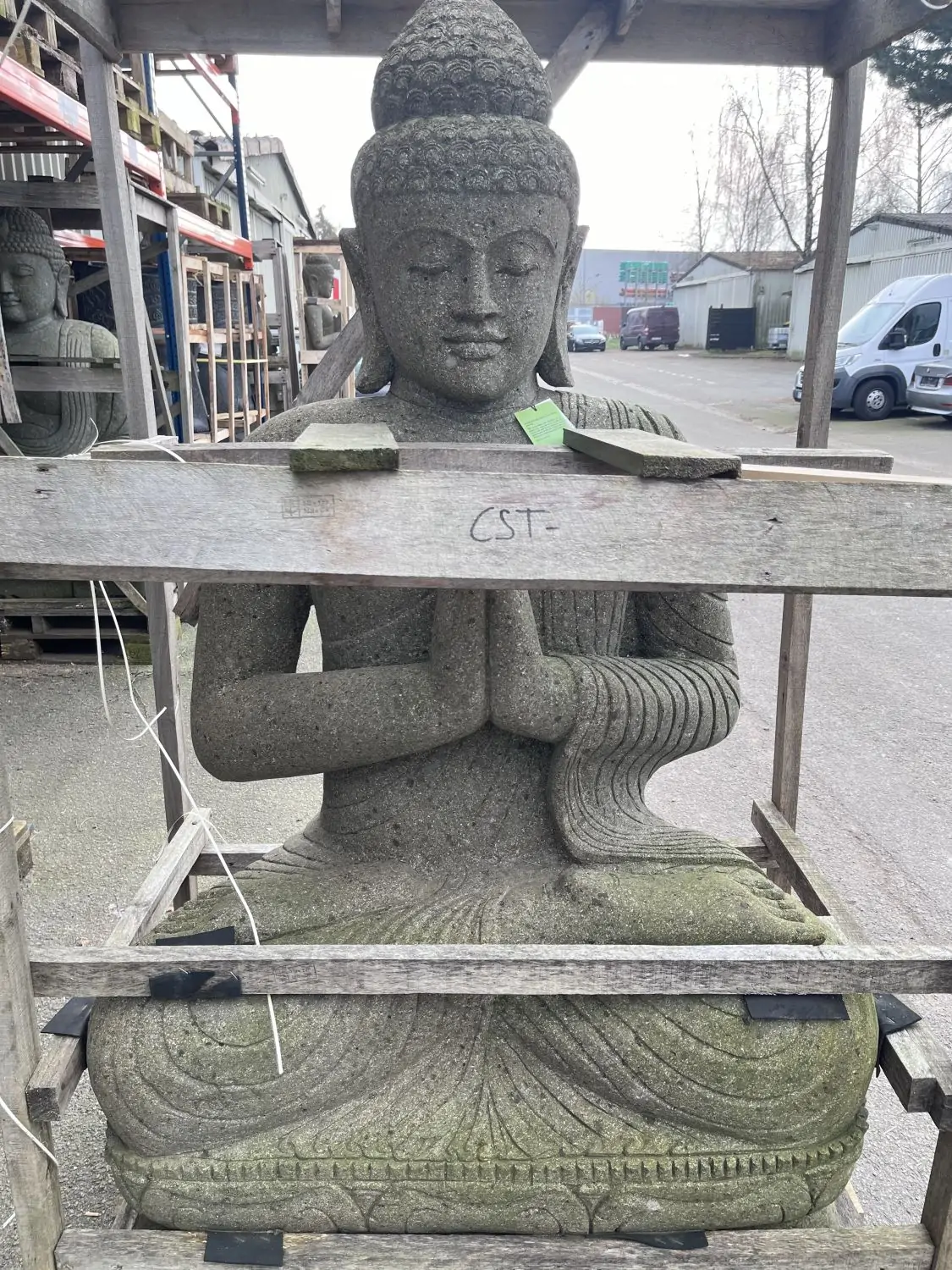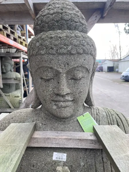 sitzender Buddha aus Naturstein (Basanit) mit Handhaltung Begrüßung, Steinmetzarbeit