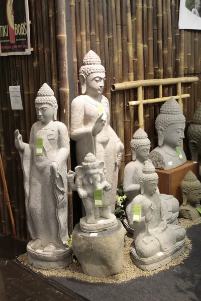 Stehender Buddha mit floralem Muster, Lehre, ca. 152 cm H, Flussstein, handgeschlagen Ein Buddha, der durch seine feine Ausarbeitung und Ausstrahlung überzeugt. Der stehende Buddha wurde aus Flussstein, einem granitähnlichen Gestein, gefertigt. Dieser Stein ist härter als der bei uns gebräuchliche Basanit und kann daher detaillierter und präziser bearbeitet werden. Nur wenige Künstler verfügen über die Fähigkeiten, diesen Stein zu einem Highlight zu machen.