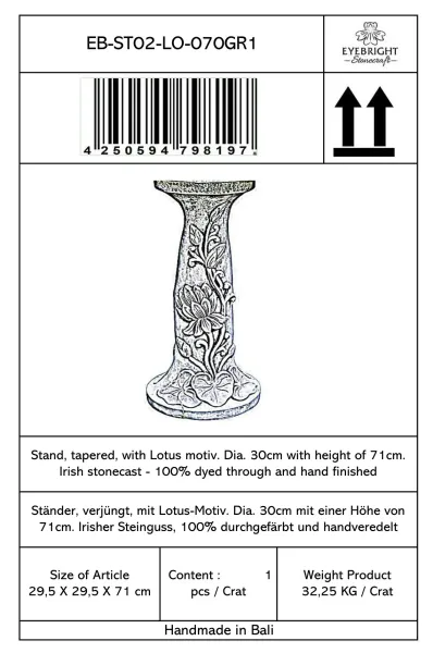 EYEBRIGHT - Stonecraft In Bali produzieren wir diesen hochwertigen Steinguss in unserer eigenen Manufaktur. Mit speziellen Verfahrenstechniken können wir detaillierte Abgüsse herstellen. Wir mischen das Rohmaterial mit Pigmenten, so dass der Guss durchgefärbt wird. Mit einer speziellen Außenfarbe setzen wir einen weiteren oberflächlichen Akzent. Während der Frostperiode sollten Sie darauf achten, dass die Figur nicht im Wasser steht, sondern z.B. auf einem Kiesbett.