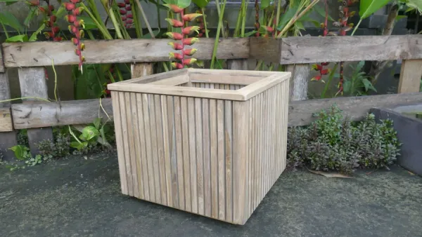 Pflanzgefäß 01A ist 43 x 43 x 38 (Innenloch ist 35x35x32cm H) aus Plantagen Teakholz. Teakholz ist eines der härtesten, stärksten und haltbarsten aller Hölzer, äußerst resistent gegen Fäulnis und nahezu unempfindlich gegen die Auswirkungen von heißer Sonne, Regen, Frost oder Schnee. Teakholz ist resistent gegen Termiten und andere Schädlinge. Teakholz ist ein Nebenprodukt des legalen Teakholzes (V-Legal) in Java.