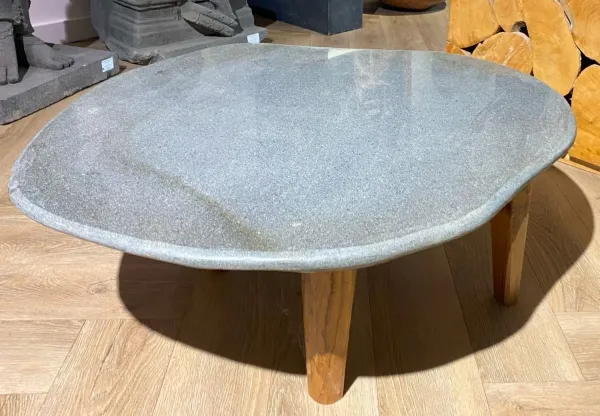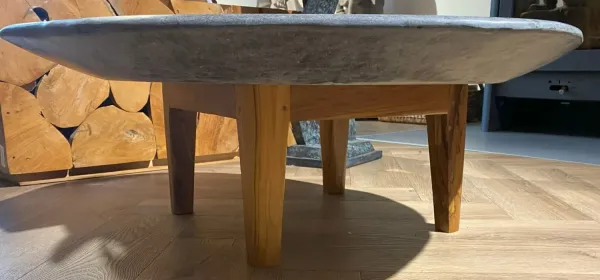 Einzigartiger runder flacher Tisch mit einer Flussstein Platte und Teakholzgestell, ca. Maße 85 x 75cm x 30cm Höhe. Die Naturstein Platte hat eine Stärke von 6 cm.