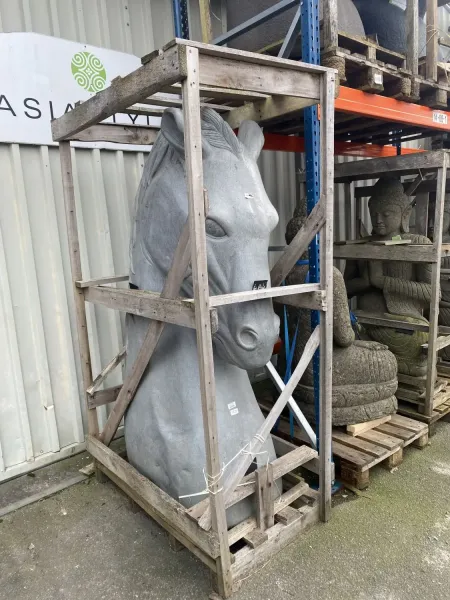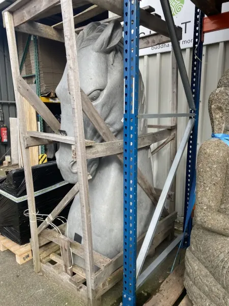 Kopf eines Pferdes aus Riverstone, nach unten blickend. 205cm Höhe.