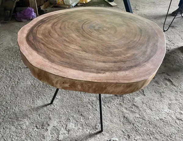 Niedriger Naturholztisch rund aus Suar mit Metallbeinen "Spider". 96cm Länge, 94cm Breite, 60cm Höhe. Tischplatte 10cm dick.