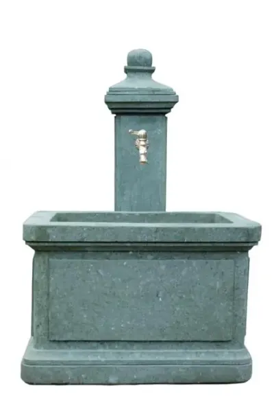 Dieser Brunnen wurde aus dem vollen Basanit-Gestein gearbeitet. Durch die charakteristisch-grüne Färbung des Lavagesteins gewinnt das Wasserspiel seine Authentizität.