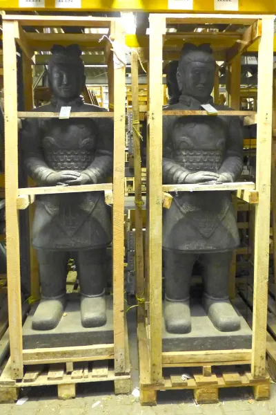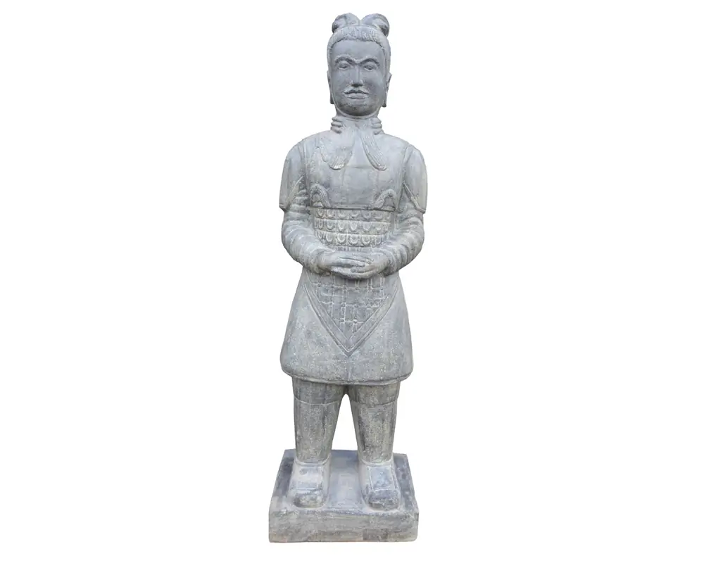 Dieser stehende chinesische Krieger wurde aus Steinguss gegossen. Die Vorlage gab einer der Krieger aus der berühmten Terracotta Armee des Kaisers Qin Shi Huang Di.