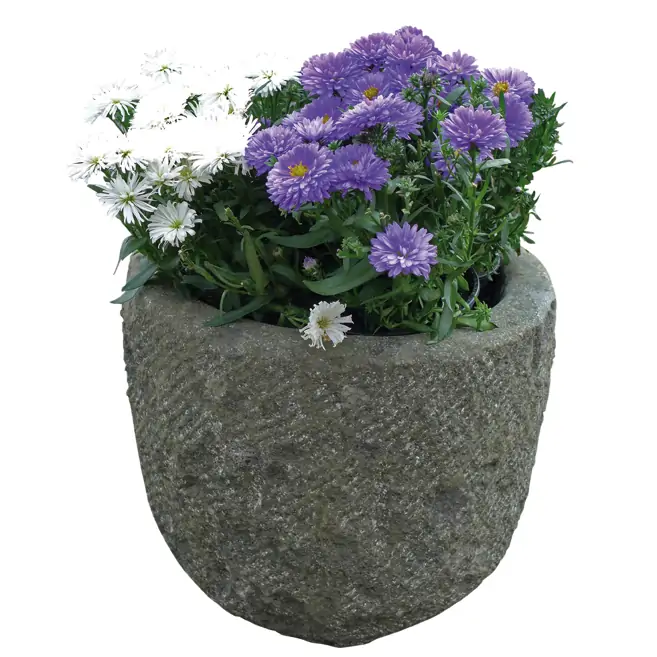 Der runde Trog mit bossierter Außenfläche wurde in traditioneller Handarbeit gefertigt und ist absolut frostbeständig und wetterfest. Somit können Sie den Trog auch im Winter im Freien stehen lassen.