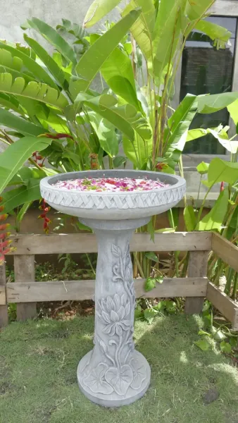 EYEBRIGHT - Stonecraft In Bali fertigen wir in unserer eigenen Manufaktur diesen hochwertigen Steinguss. Mit speziellen Verfahrenstechniken können wir detaillierte Abgüsse fertigen. Wir vermischen das Ausgangsmaterial mit Pigmenten, so dass der Guss durchgehend gefärbt ist. Mit einer speziellen Outdoorfarbe geben wir noch einen weiteren oberflächlichen Akzent. Während der Frostperiode sollten Sie dafür Sorge tragen, dass die Figur nicht im Wasser steht, sondern z.B.auf einem Kiesbett.
