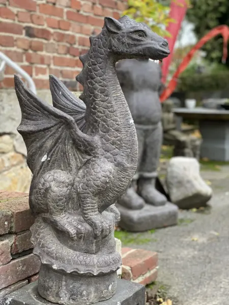 Sitzender Drache aus Steinguss (Vollguss) in 75 cm Höhe, handveredelt & coloriert.