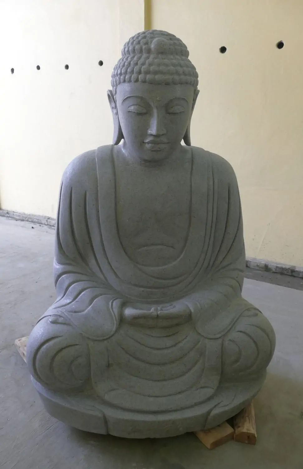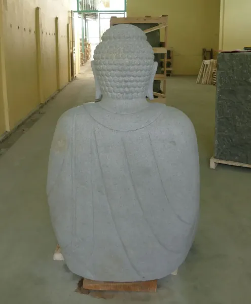 Sitzender Buddha Japanisch. Dhyana-Stellung - Geste der Meditation. Eine Buddhaskulptur im japanischen Stil, die durch ihre feine Ausarbeitung und Ausstrahlung besticht. Riverstone ist ein Stein, der dem Granit ähnlich ist. Dieser Stein ist härter als der uns vertraute Basanit und kann daher präziser und detaillierter bearbeitet werden. Nur wenige Künstler haben die Fähigkeit, diesen Stein zu einem Highlight zu verarbeiten. Dhyana: Die beiden Hände dieses Buddhas ruhen auf dem Knie. "Dhyana" bedeutet so viel wie "verbunden mit Kontemplation und Meditation".