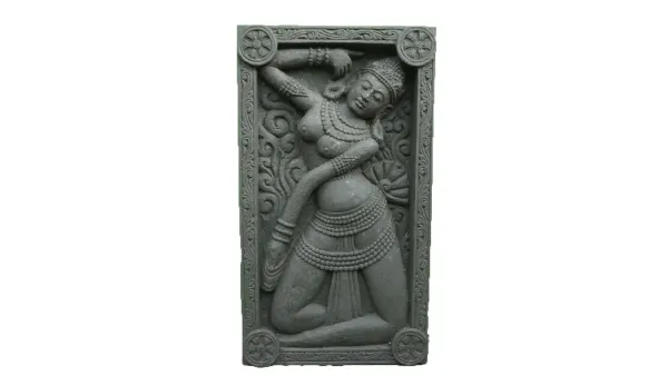 Relieffiguren in geradem Rahmen 55x100cm vertikal (Frauenfiguren) . Basanit ist ein vulkanisches, grünliches Gestein. Der Stein erhält seine charakteristische Farbe durch viele Tonminerale. Die kleinen bis mittelgroßen Vertiefungen im Gestein sind ein charakteristisches Merkmal und kennzeichnen die gute Qualität des Natursteins. Die Skulpturen sind frostbeständig, vertragen aber kein Streusalz.