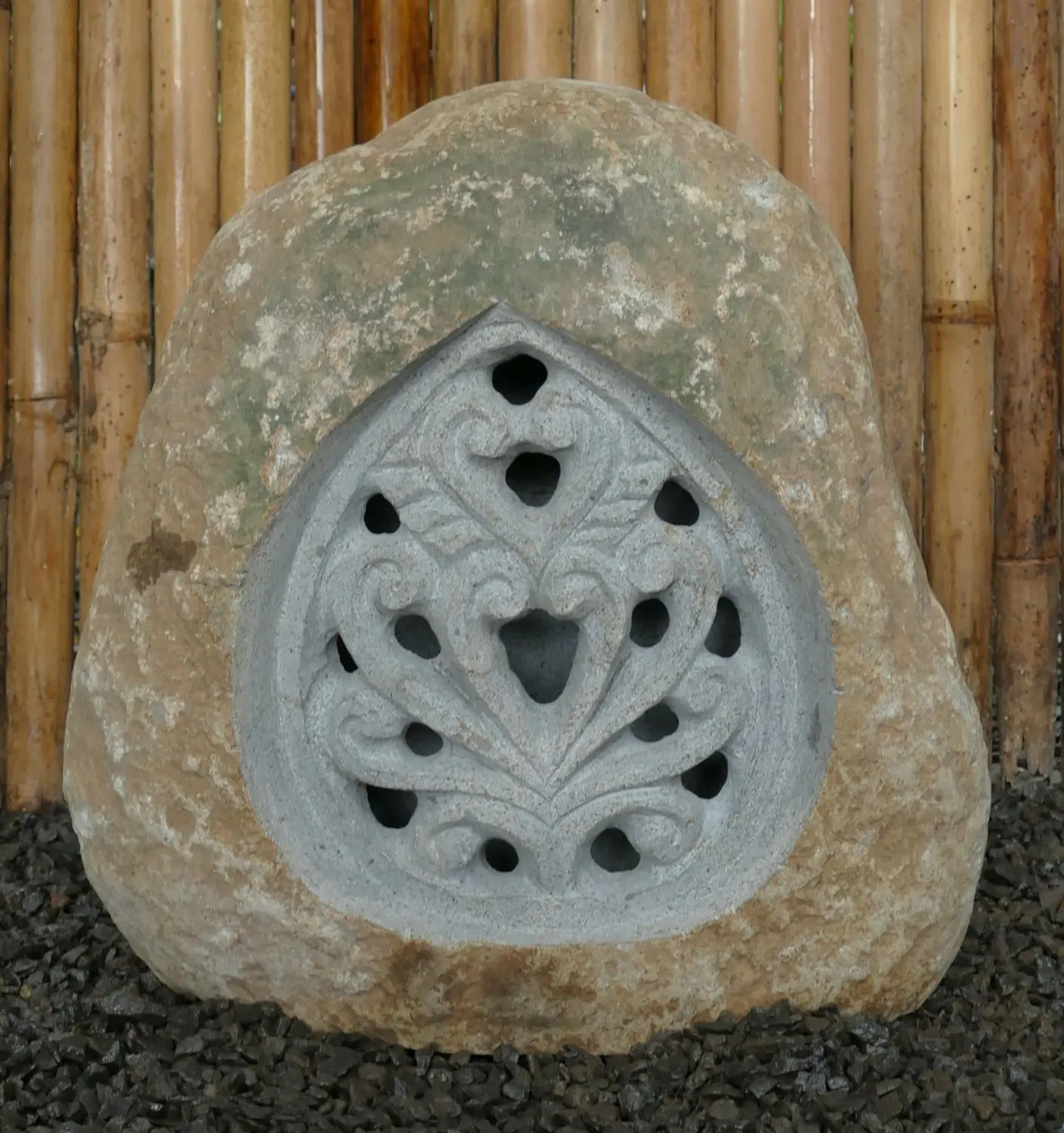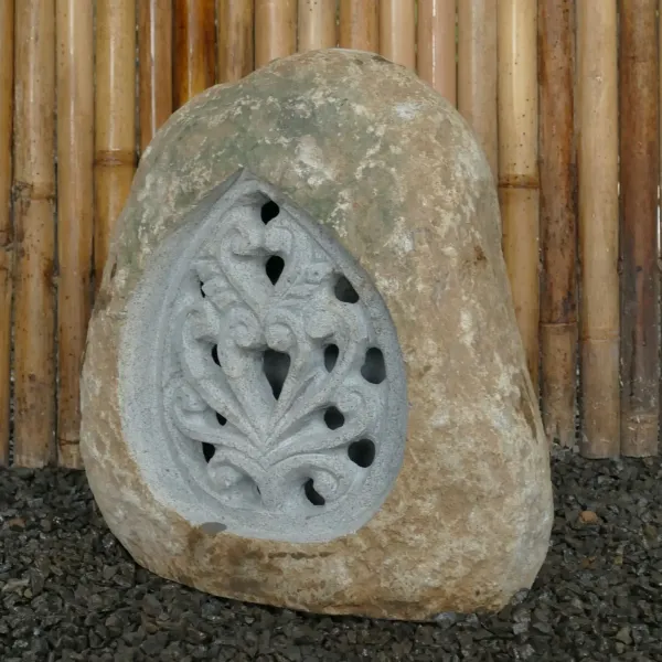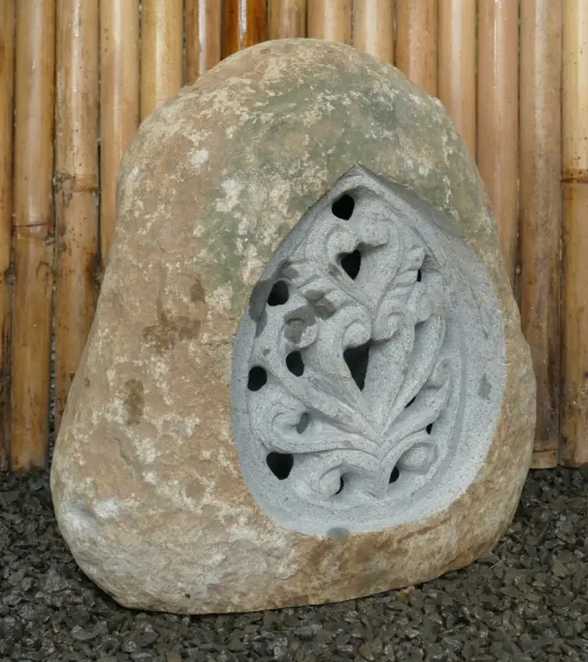 Riverstone Laterne mit geschnitztem Motiv auf einer Seite, Licht kann durchscheinen! Gartenlaterne mit einem Gesicht im Inneren der Kiste verpackt. Tauchen Sie Ihren Garten, Ihre Veranda oder Terrasse in ein angenehm gedämpftes Licht. Die Laterne aus Flussstein ist handgefertigt und ausgehöhlt. Die Steinlaterne kann elektrifiziert werden. Das Loch für die Kabelführung ist vorhanden, Sie können die Laterne aber auch ohne Strom einfach mit einer großen Kerze im Inneren beleuchten. Durch die geschlitzte Außenhülle und das flackernde Kerzenlicht wird diese Laterne zu einem absoluten Blickfang. Sie schafft ein harmonisches Ambiente in Ihrem Garten. Da es sich um ein handgefertigtes Naturprodukt handelt, ist jede Laterne ein Unikat. Der Flussstein ist absolut frostsicher und daher ganzjährig für den Außenbereich geeignet.