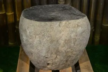 Flussstein mit gerader Fläche oben und unten, als Sockel.