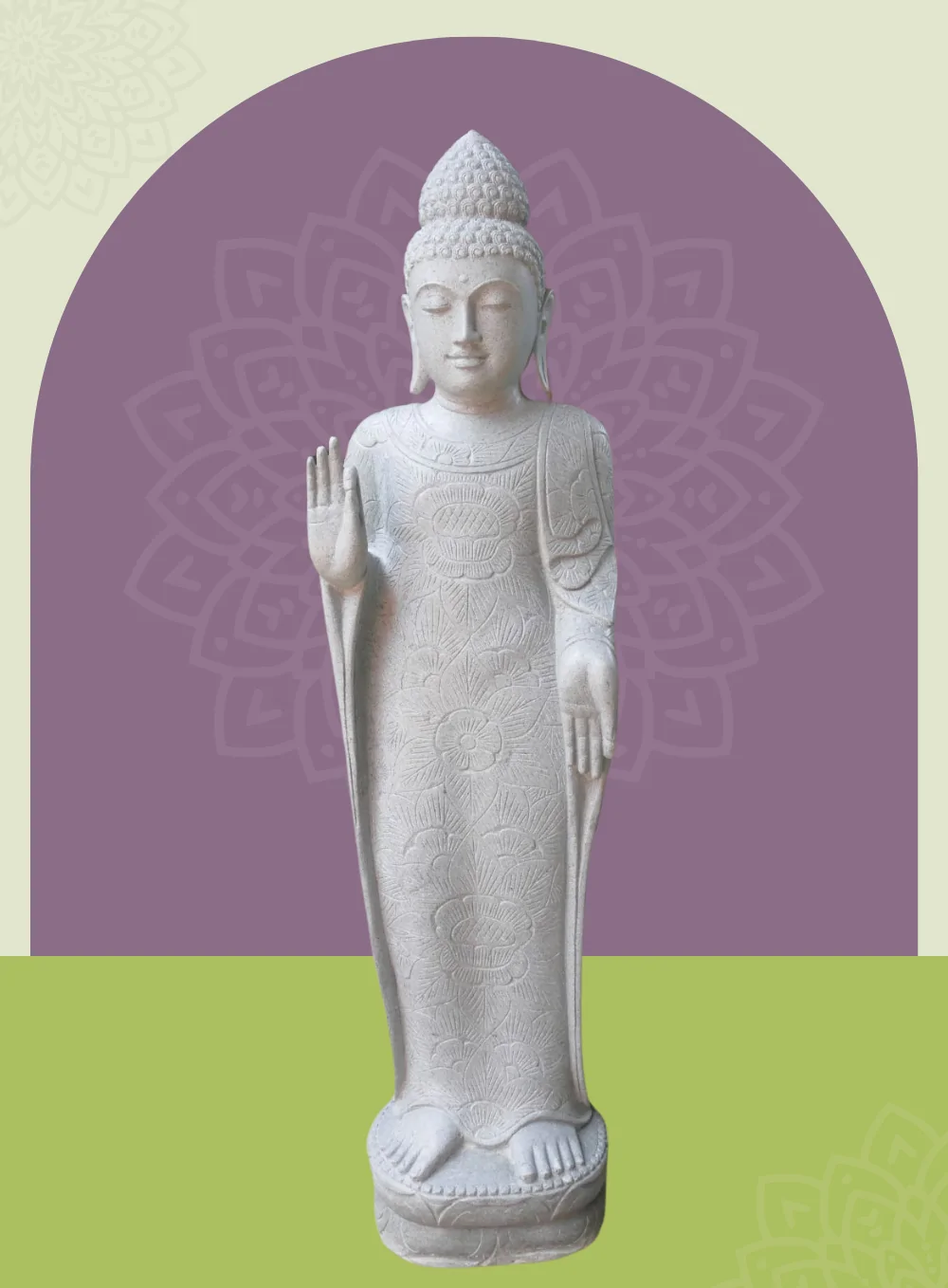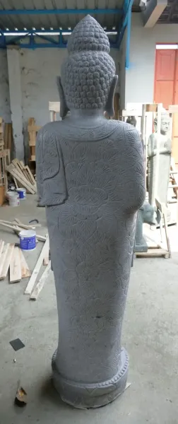 Stehender Buddha mit floraler Schnitzerei – Abudaya-Stellung, ca. 180 cm (Flussstein-Unikat)