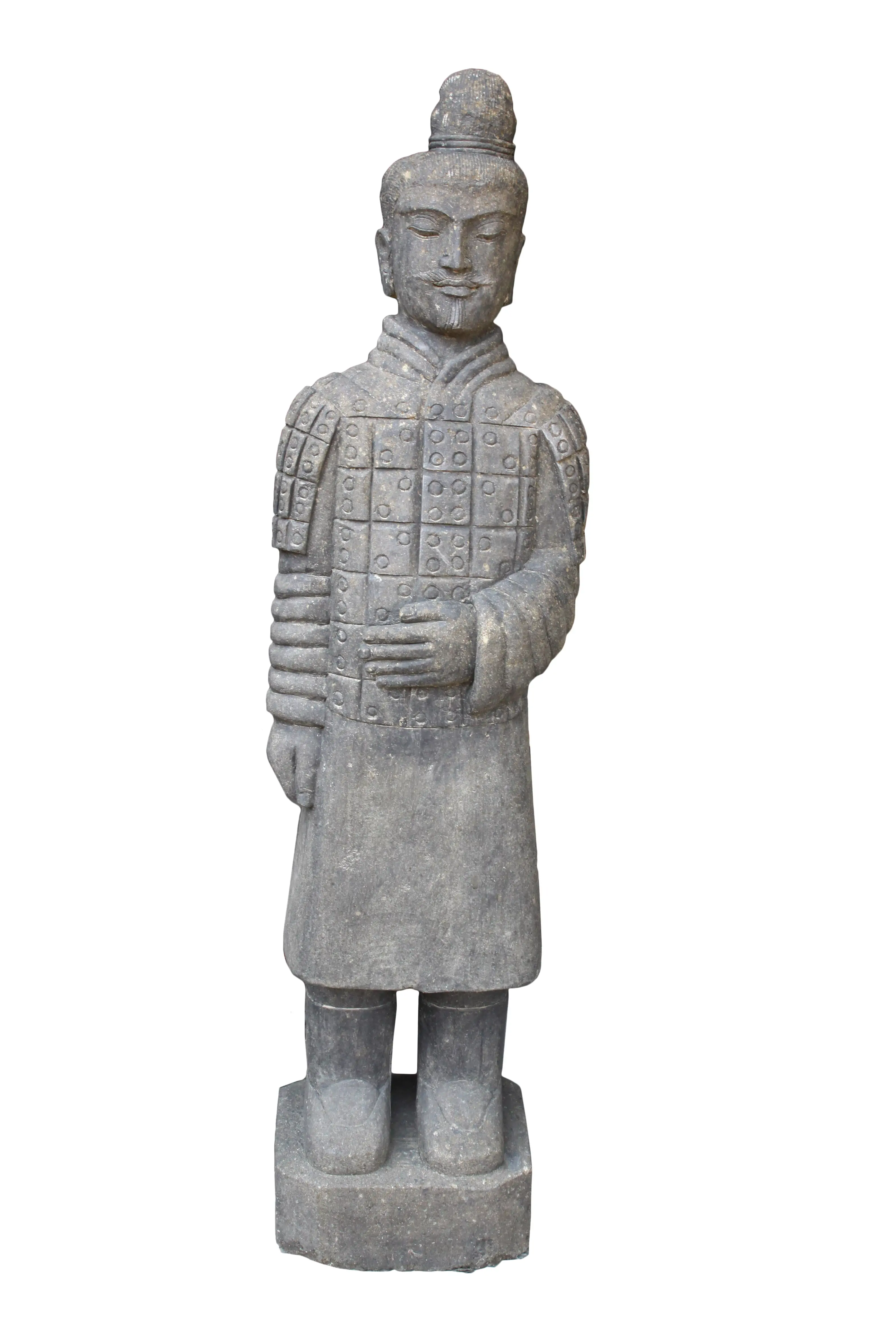 chinesische Kriegerfigur aus Naturstein (Basanit), Steinmetzarbeit, mit einem Antikfinish veredelt