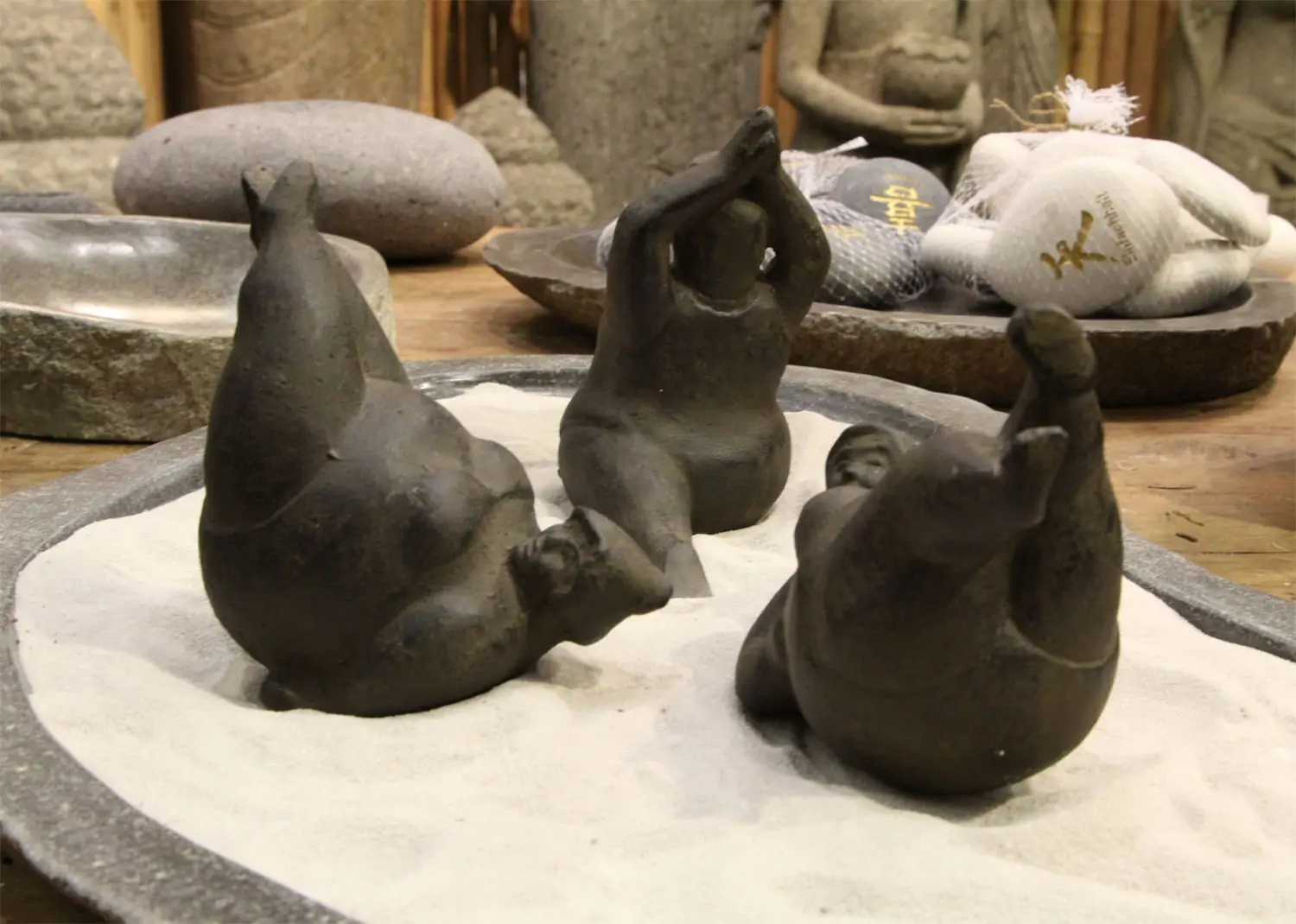 Die Skulpturen wurden aus Steinguss hergestellt und mit einem Finish veredelt. Die Färbung kann variieren und durch Witterungseinflüsse verblassen.