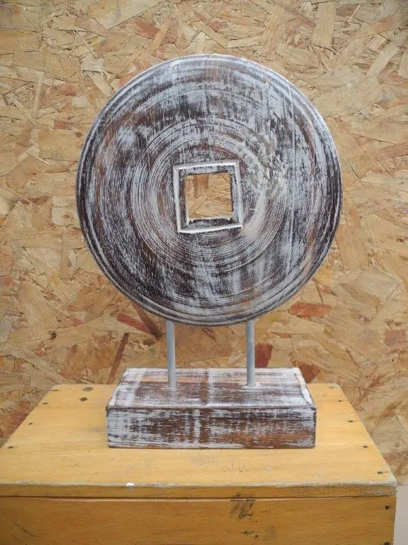 Chinesische Münze auf Holzsockel. 35 cm hoch Nadelholz, Metalständer, 24x10x35h weiß lasiert