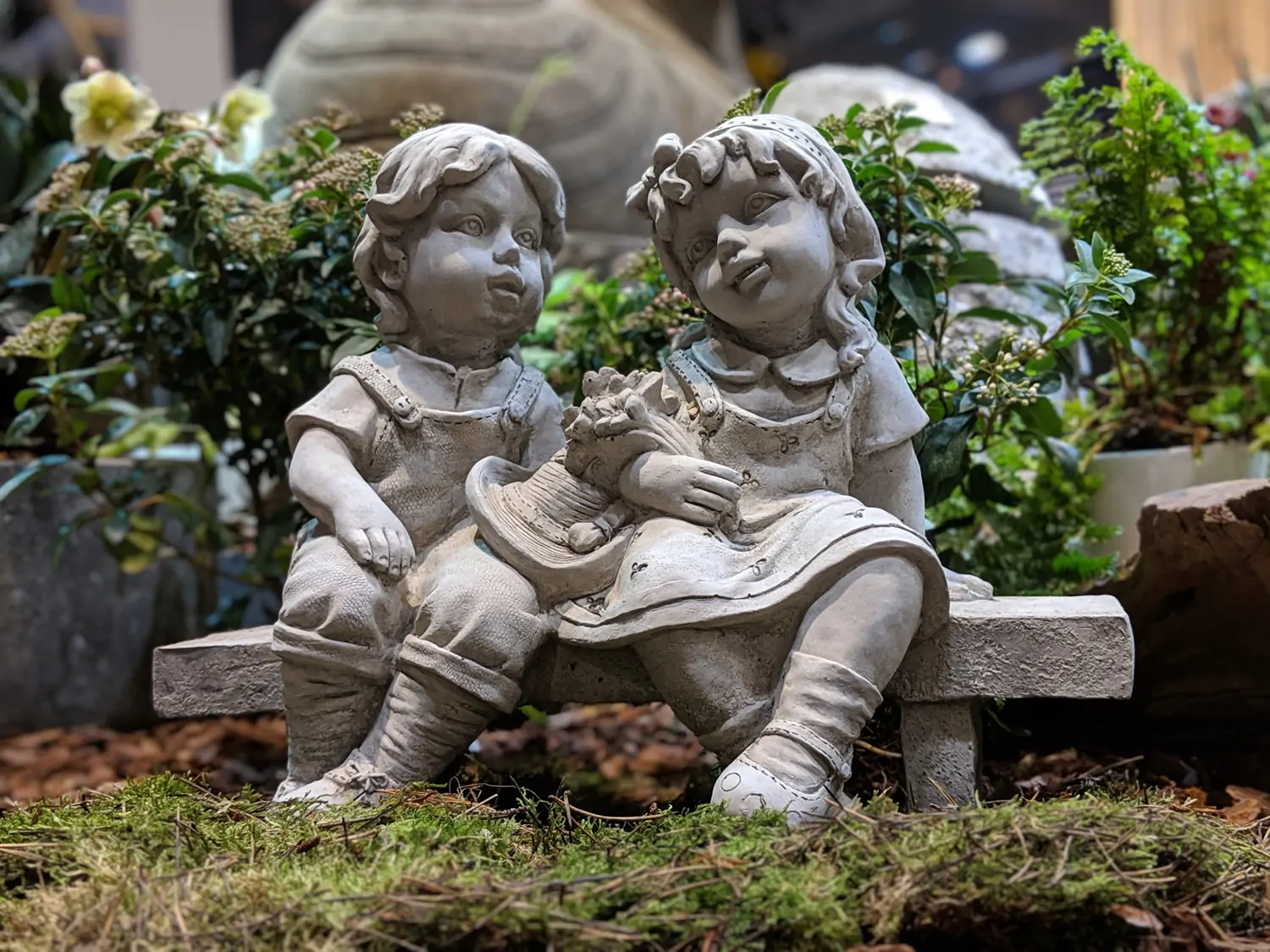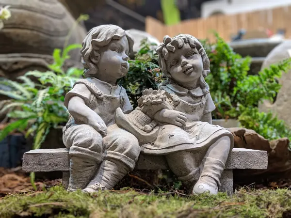 Steinfigur Paar auf Bank, Gartenfigur, 40 cm lang