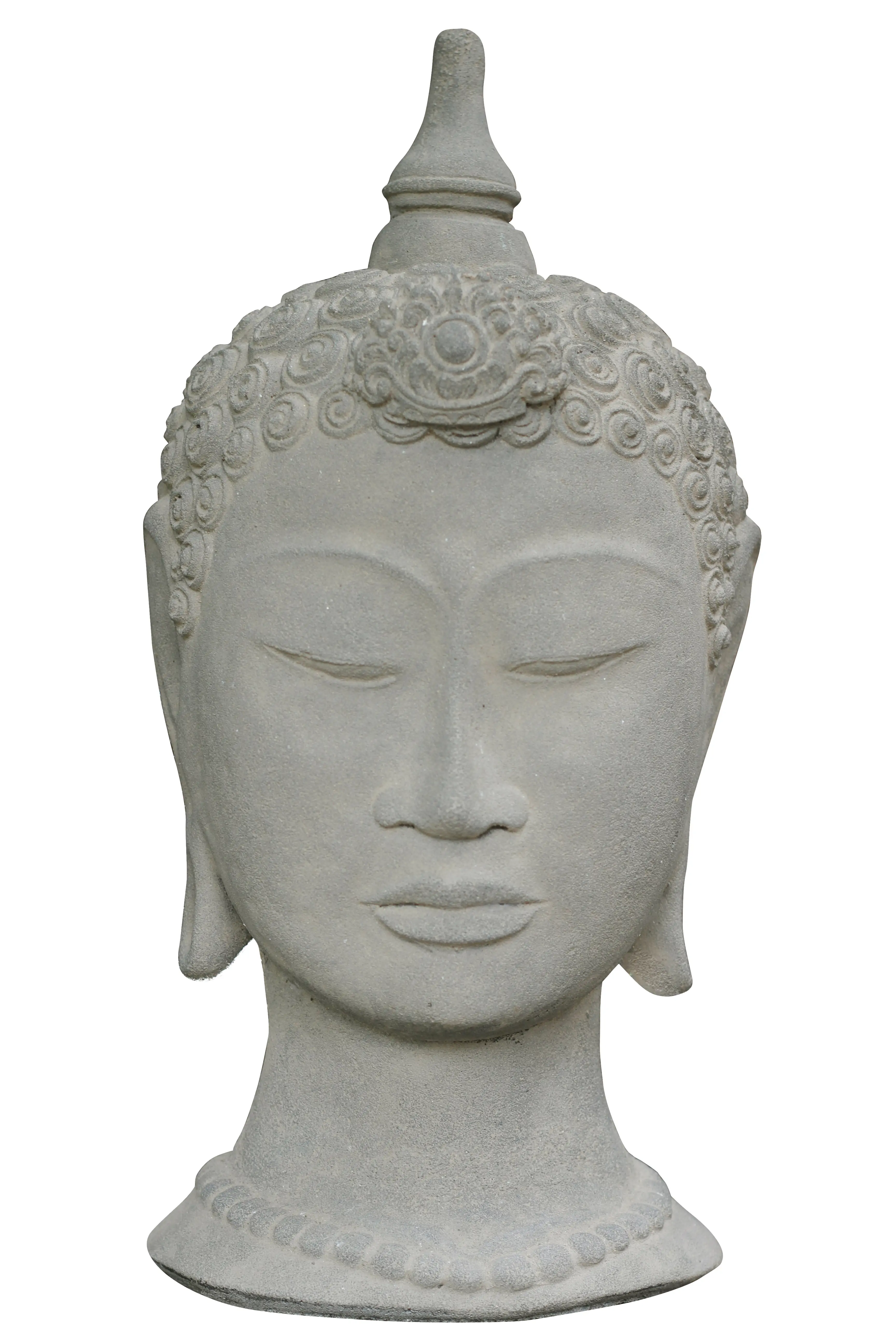 Buddha-Büste im thailändischen Stil, ca. 43 cm hoch, aus Lavagestein gegossen. Diese authentische Figur wird aus Beton und Steingut im sogenannten Trockengussverfahren hergestellt. Bei diesem Verfahren wird nur wenig Flüssigkeit verwendet, wodurch die Figur ihre charakteristische raue Oberfläche erhält, die der eines Natursteins ähnelt. Nach den üblichen Arbeitsschritten des Gießverfahrens werden die Konturen der Skulptur von Hand nachgearbeitet und vollendet. Alle Skulpturen aus Formstein sind absolut frostsicher und können das ganze Jahr über im Freien verwendet werden.