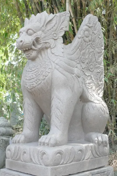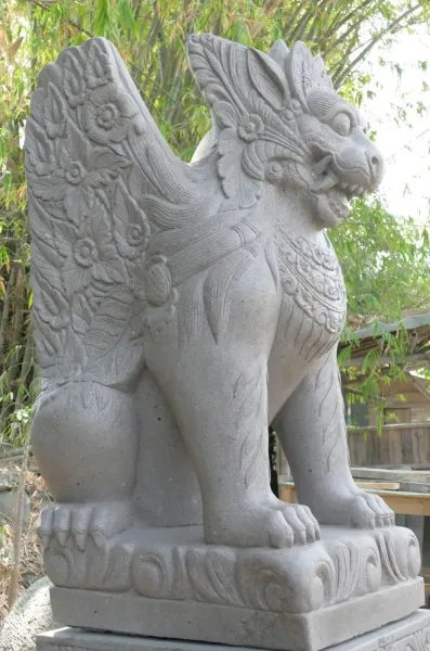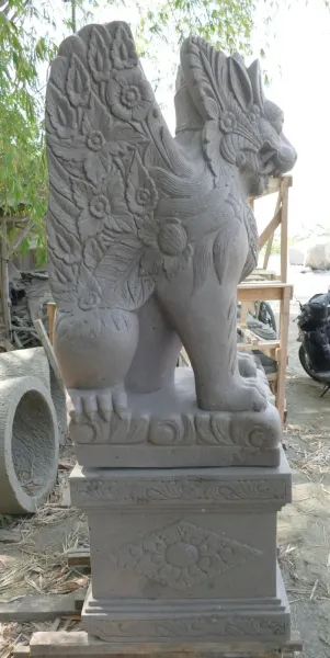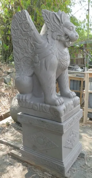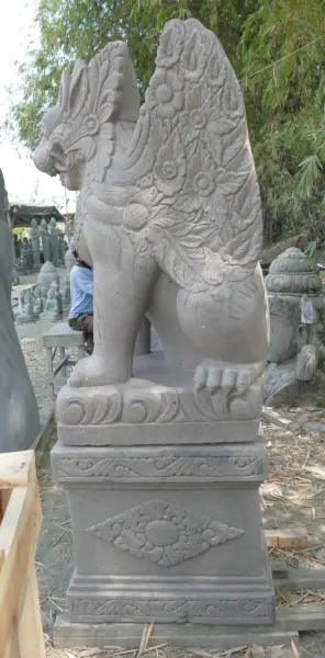 Set von Singa Ambaraja, bestehend aus der Skulptur und Sockel. Gesamthöhe ist 223cm. (82 x 81 x 150 cm Singa plus Sockel 68 x 80 x 72 cm Höhe)