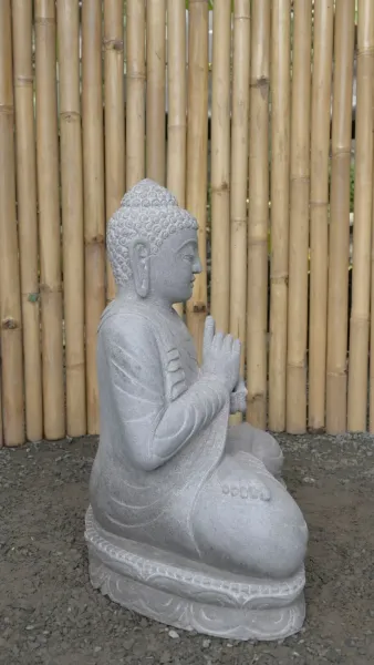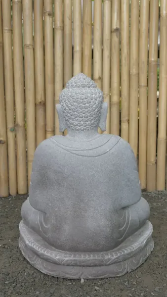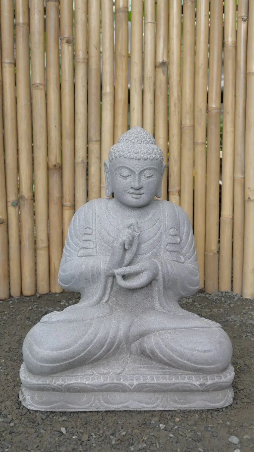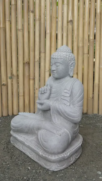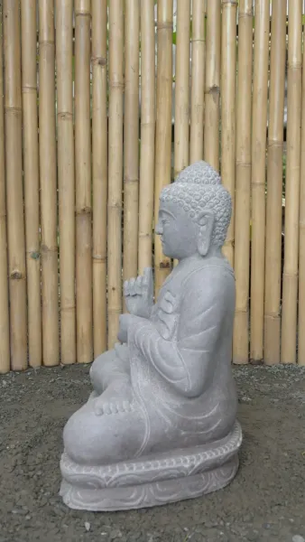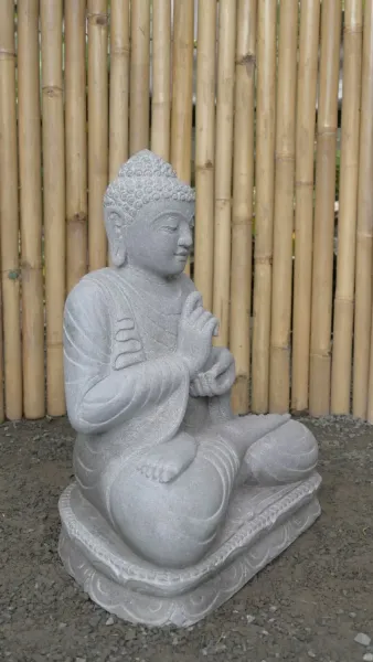 Sitzender Buddha aus Flussstein in Dharmachakra-Stellung - Geste des Rades der Dharma-Lehre. Ungefähr 62cm Höhe.