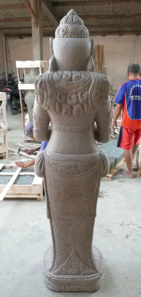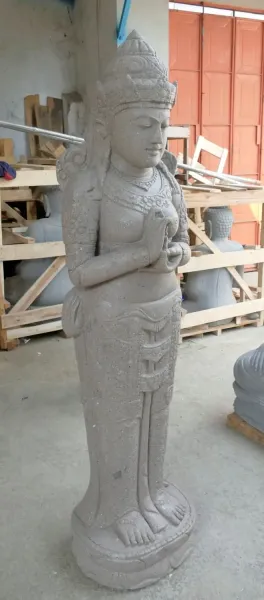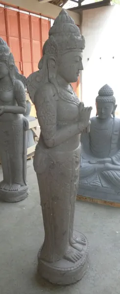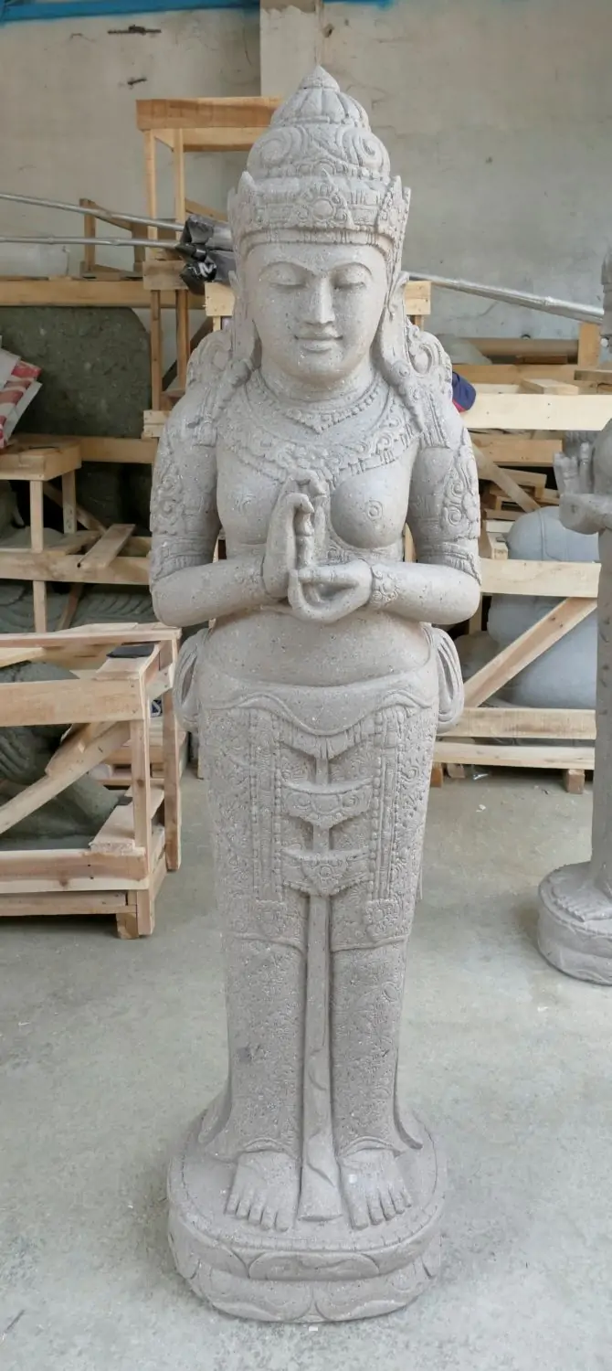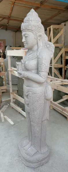 Dewi Sri gilt als wichtige Fruchtbarkeitsgöttin, vor allem auf Bali und Java. Sie reguliert alles Leben, lenkt vor allem in ihrer Funktion als Mondgöttin das Gedeihen der Nahrung, die auf der Erde wächst und bestimmt den Tod, der Pflanzen, Tiere und Menschen in ihren Schoß zurückkehren lässt. So gebietet sie auch über die Unterwelt und die Anderswelt. Vor allem aber sorgt er für die Ernährung der Menschen und sichert so ihr Überleben. Da Reis das Hauptnahrungsmittel in dieser Region ist, ist Dewi Sri vor allem die verehrte Reisgöttin. Sie wird als eine Göttin von ungewöhnlicher Schönheit dargestellt. Sie wird immer als jugendlich, geschmeidig und schlank dargestellt. Die Skulptur wurde aus Flussstein, einem granitähnlichen Stein, gefertigt. Dieser Stein ist härter als der bei uns übliche Basanit und kann daher detaillierter und präziser bearbeitet werden. Nur wenige Künstler verfügen über die Fähigkeiten, diesen Stein zu einem Highlight zu machen. wurde aus Kunststein gefertigt und mit einem Finish versehen. Die Farbgebung kann aufgrund der Witterung variieren und verblassen Die Göttin hält beide Hände in Brusthöhe. Zeigefinger und Daumen jeder Hand bilden einen Kreis, die Fingerspitzen der linken Hand berühren die Handfläche der rechten Hand: Diese Handhaltung wird genannt: Das Rad der Lehre in Bewegung setzen (Dharmachakra Mudra).