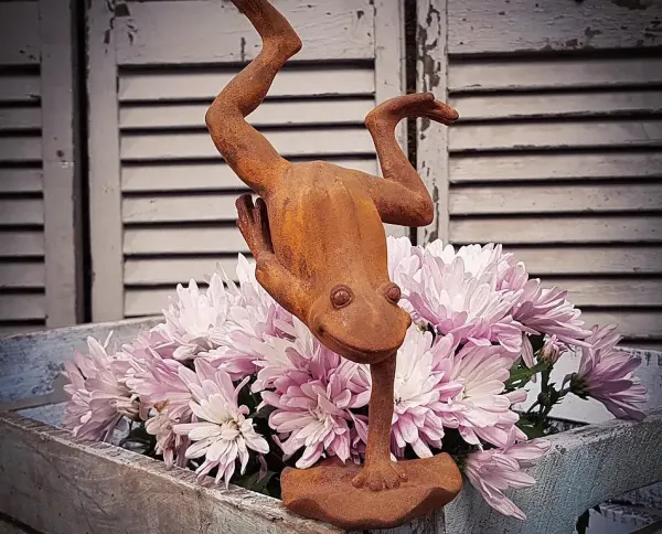 Cast iron frog in one-armed handstand with rust finish and 24 cm height