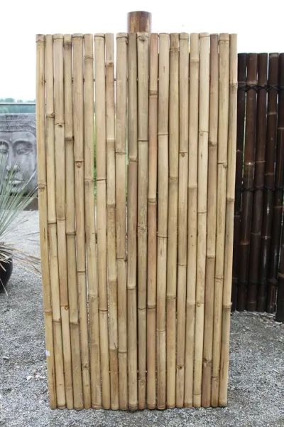 bamboo fence (full cane), rigidly connected with bamboo, yellow-brown, slightly conical, varnished, ca. 90x180 cm, Ø 3-5 cm