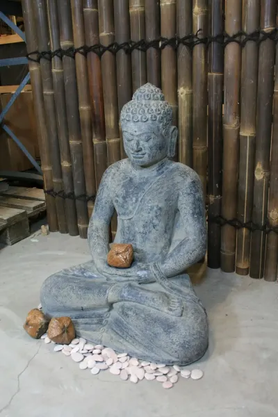 Buddha, sitting in Borobudur style, approx. 76 cm high, cast lava stone. This special Buddha from our Yogya collection is made of concrete and earthenware in a so-called dry casting process. In the course of this process, very little liquid is used, giving the figure its characteristically rough surface, similar to that of a natural stone. Following the usual working procedures of the casting process, the contours of the sculpture are reworked and refined by hand. All sculptures made of moulded stone are absolutely frost-proof and can be used outdoors all year round.