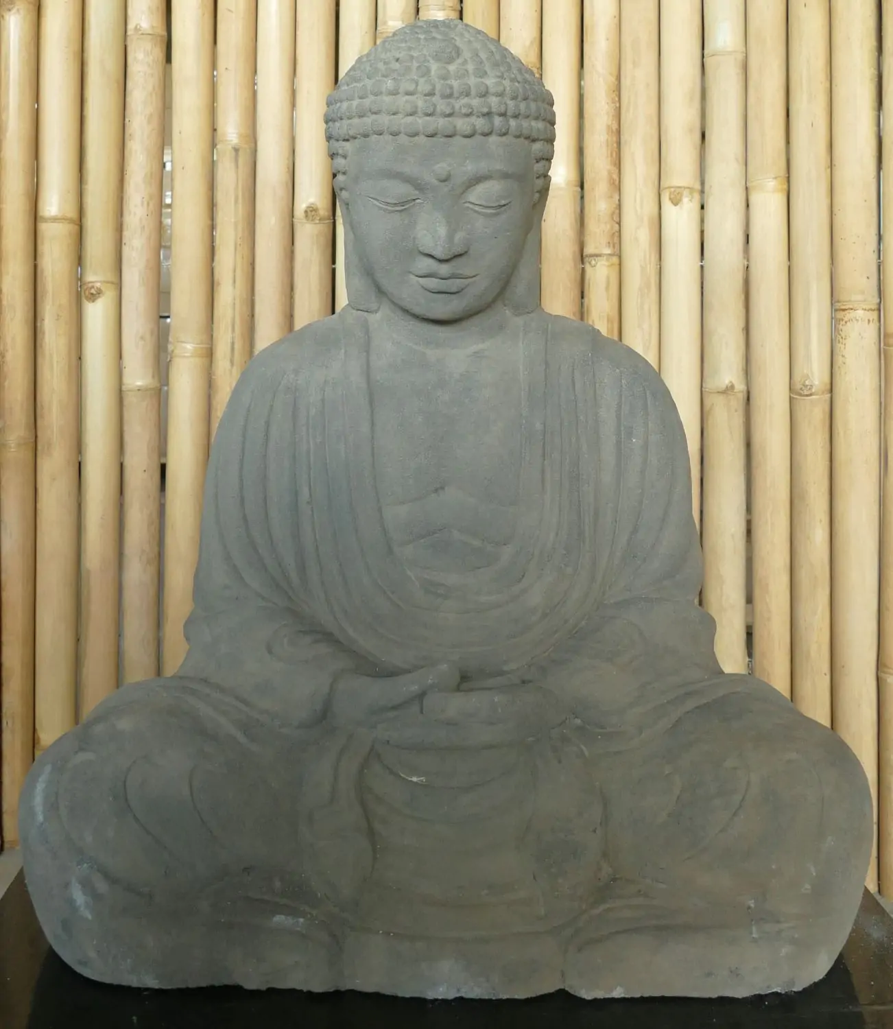 Buddha, sitting in Japanese style, approx. 65 cm high, cast from lava stone. This special Buddha from our Yogya collection is made of concrete and earthenware in the so-called dry casting process. This process uses very little liquid, which gives the figure its characteristic rough surface, similar to that of a natural stone. After the usual steps of the casting process, the contours of the sculpture are reworked and refined by hand. The Buddha figure has both hands resting loosely in the lap, one hand resting on the other, the palms facing upwards: This hand posture symbolises meditation (Dhyana mudra). All cast stone sculptures are absolutely frost-proof and can be placed outdoors all year round.