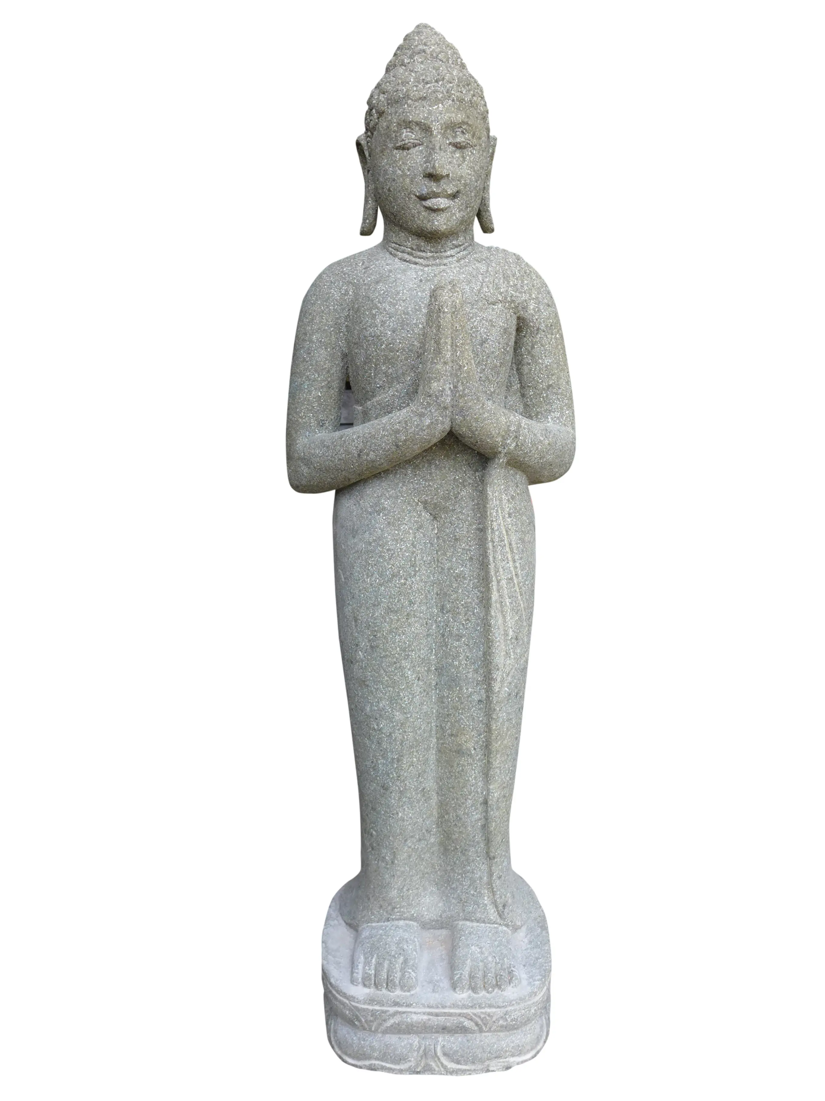 This Buddha is made of natural stone (basanite) and comes to us from Indonesia. The Buddha has a pleasantly inviting effect on the observer, especially since the Buddha's hand position is a greeting. Thus the Buddha is perfectly suited for a position in your entrance area, from where it promises a friendly and contemplative atmosphere to your visitors. The Buddha can stand outside at any time of the year, as it is of high quality and frost-proof. The historical Buddha advised his followers not to blindly follow any teaching, but to critically question all teachings and to test them on their own experience. This tolerance has a sympathetic effect on most people. The Buddha thus traditionally symbolises serenity and peace. This figure of the Buddha from our shop radiates these qualities wonderfully to its surroundings and brings a good mood in your home.