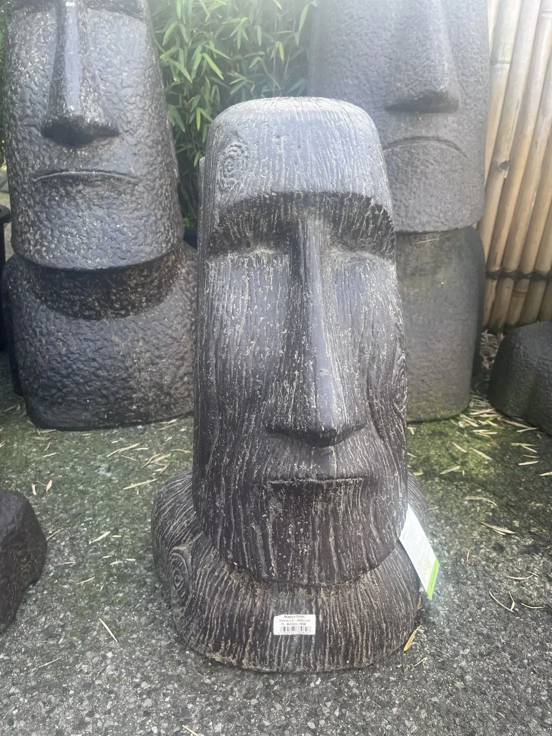 Exhibition piece - Moai head in wood look. The size is 40 x 35 x 64cm. Cast stone, handcrafted & coloured. Cast stone with antique finish, handcrafted rework. Around 890 monumental stone sculptures of various sizes can be found on Easter Island. The Rano Raraku volcano was their sacred place of origin. The age of the Moais cannot be determined with certainty. Archaeologists agree that Easter Island was colonised around the 4th or 5th century AD and that the indigenous people began to build altars and the first statues relatively quickly after this. The moais with round or square heads and eye sockets are thought to have been created from around the 12th to 13th century AD, while the more modern moais (mainly at Rano Raraku) were created from around the 15th/16th century AD. A moai figure for the garden by Asiastyle The moai sculpture was made from high-quality cast stone using the hollow casting process to save weight. Originals made from solid stone serve as a model. In an elaborate work process, each sculpture is finished by hand. The colouring may vary and fade due to weathering. A Moai enriches your garden with its interesting and mysterious facial expression.