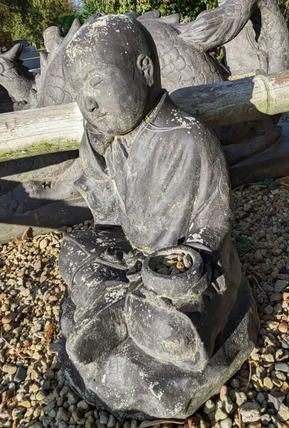 A unique sitting monk with the bowl in the middle. The height is 43 cm. The sculpture was made of cast stone and finished with a finish. The colour may vary and fade due to weathering, but the finish does not affect the frost resistance. The figures are suitable for indoor and outdoor use.