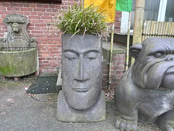 The sculpture was made of cast stone and finished with a finish. The colour may vary and fade due to weathering, but the finish does not affect the frost resistance. The figures are suitable for indoor and outdoor use.