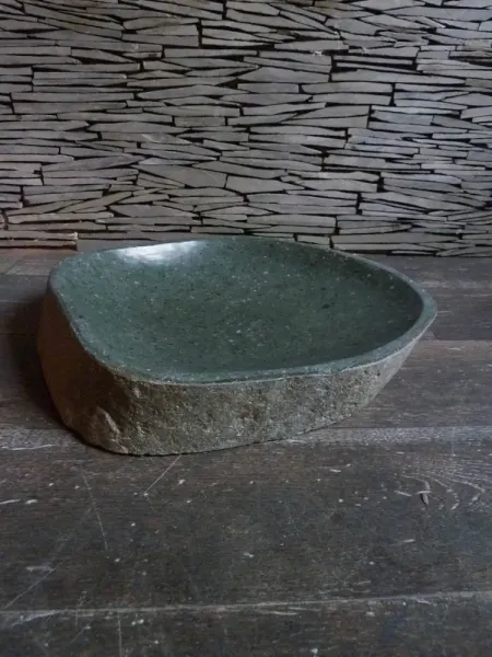 Flat stone bowl from natural stone (river stone), ground and polished