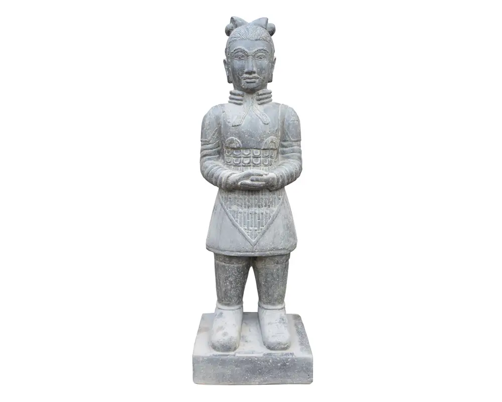 This standing Chinese warrior was cast in stone. The template was given by one of the warriors from the famous terracotta army of Emperor Qin Shi Huang Di.