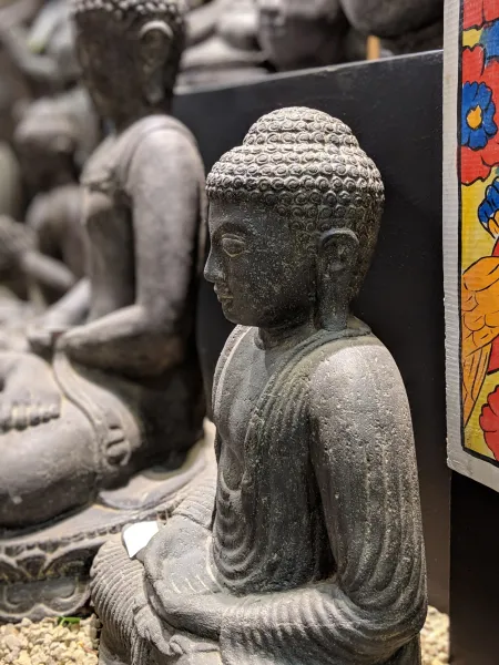 Seated Buddha made of pressed stone (solid casting), height 40 cm, hand-painted, antique finish