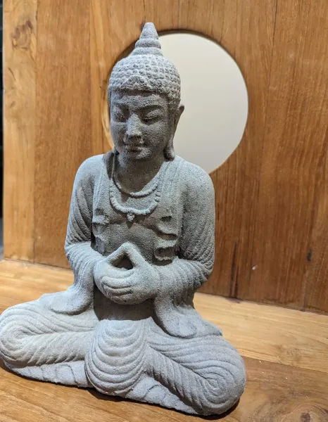 Buddha, sitting in Thai style, approx. 28 cm high, cast lava stone. This special Buddha from our Yogya collection is made of concrete and earthenware in a so-called dry casting process. In the course of this process, very little liquid is used, giving the figure its characteristically rough surface, similar to that of a natural stone. Following the usual working procedures of the casting process, the contours of the sculpture are reworked and refined by hand. The hands of this Buddha are folded in front of his chest, reminiscent of the Namaste and meditation gestures. All sculptures made of moulded stone are absolutely frost-proof and can be used outdoors all year round.