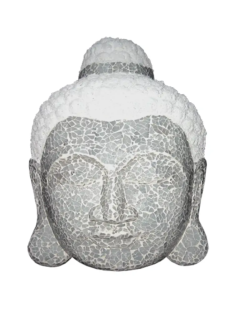 This beautiful Buddha head radiates a warm contentment, which is further enhanced by the surface covered with small mirror plates